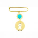 Παιδική παραμάνα σε κίτρινο χρυσό 14kt με χρυσό δίσκο και εσωτερικό εγχάρακτο τα αρχικά της ευχής "Ιησούς Χριστός Νικά". Ένα ματάκι από φίλντισι και τυρκουάζ συνδέουν το φυλαχτό και την παραμάνα με μοναδικό τρόπο!