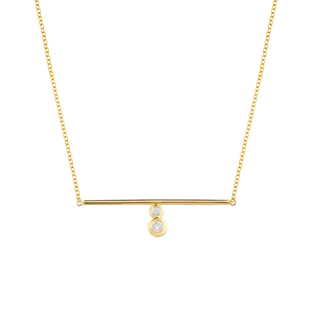 Κολιέ με μια λεπτή μπάρα σε κίτρινο χρυσό 14kt. Μικρά φυσικά διαμάντια brilliant cut, με ιδιαίτερο δέσιμο στο κέντρο του σχεδίου, δημιουργούν μια διακριτική αίσθηση πολυτέλειας.